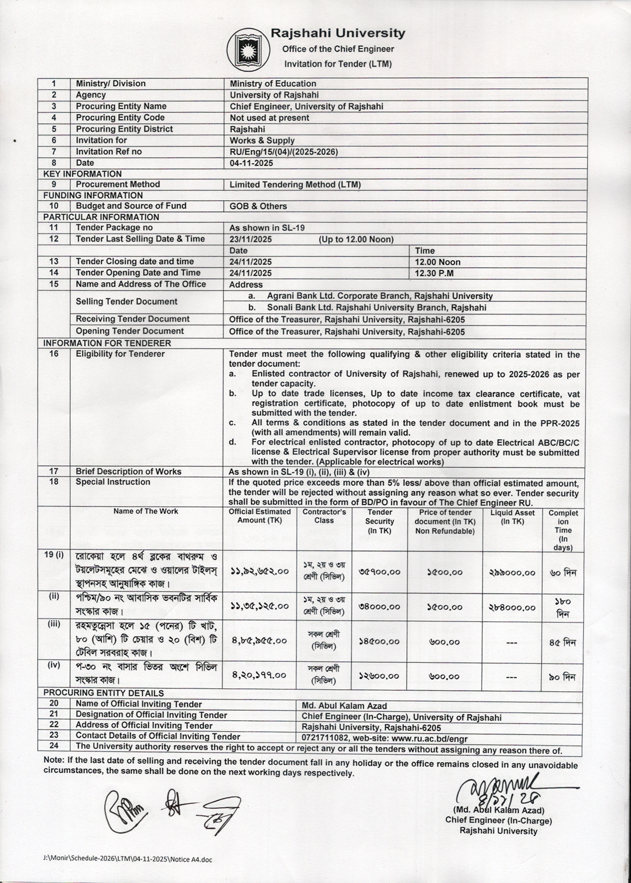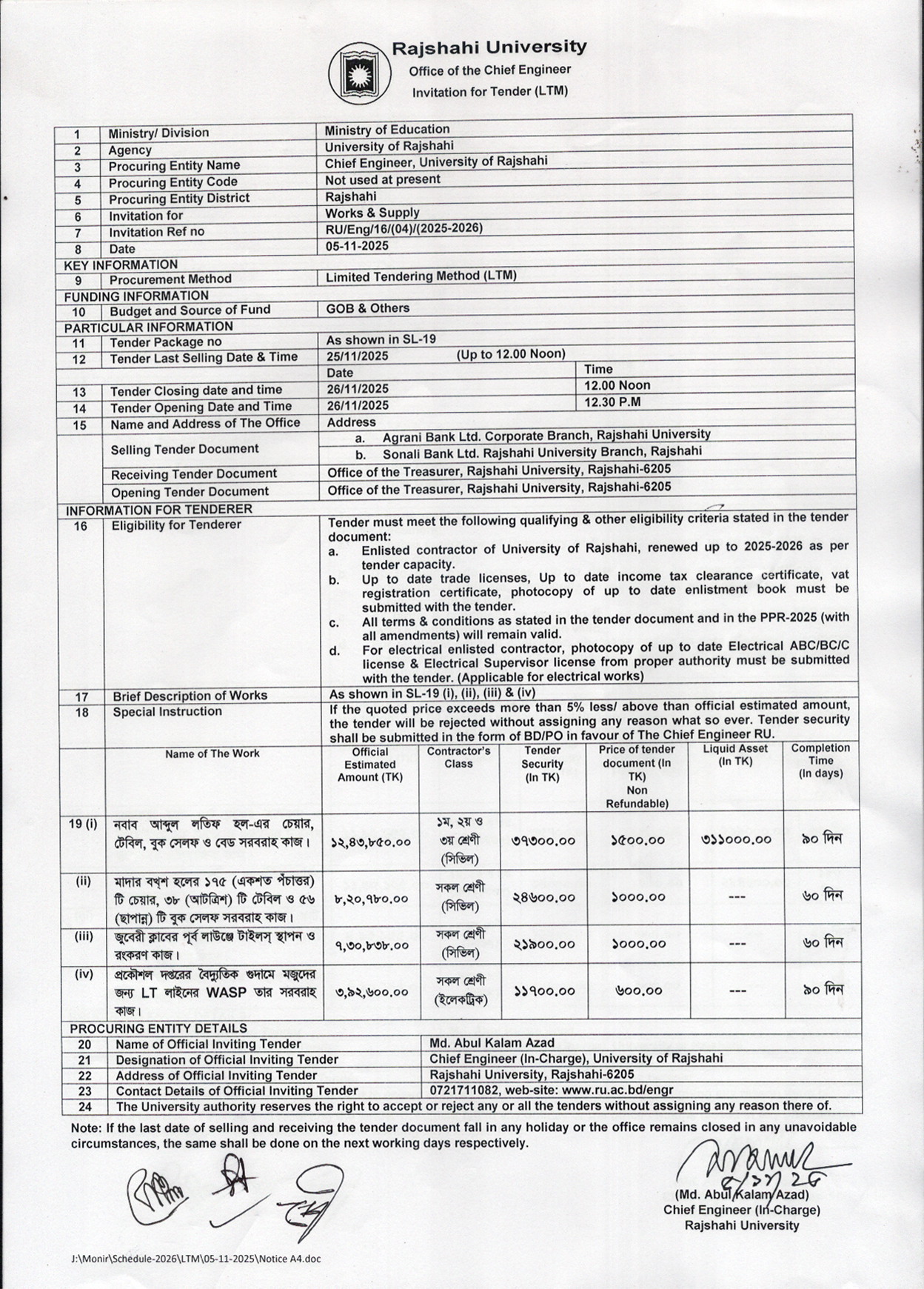 Latest Notices 05Nov Limited Tendering Method 05-11-2025 05Nov Limited Tendering Method 05-11-2025 02Nov Limited Tendering Method 02-11-2025 30Oct Limited Tendering Method 29-10-2025 29Oct Limited Tendering Method 29-10-2025 22Oct Limited Tendering Method 22-10-2025 20Oct Limited Tendering Method 19-10-2025 15Oct বাসা-বাড়ি বরাদ্দ বিজ্ঞপ্তি (শিক্ষক/অফিসার) সংশোধিত 05Oct Limited Tendering Method 05-10-2025 05Oct বাসা-বাড়ি বরাদ্দ বিজ্ঞপ্তি (শিক্ষক/অফিসার) 18Sep Limited Tendering Method 18-09-2025 15Sep নবায়ন বিজ্ঞপ্তি 15Sep ঠিকাদার তালিকাভুক্তি/পদোন্নতি কমিটির সভার কার্যবিবরনী 15Sep তালিকাভুক্তি ও পদোন্নতি বিজ্ঞপ্তি 03Sep Limited Tendering Method 03-09-2025 31Aug Limited Tendering Method 31-08-2025 27Aug Limited Tendering Method 27-08-2025 25Aug Limited Tendering Method 25-08-2025 21Aug Limited Tendering Method 21-08-2025 29Jul e-Tender Notice 16Jul Limited Tendering Method 16-07-2025 14Jul Limited Tendering Method 14-07-2025 22Jun Limited Tendering Method 22-06-2025 16Jun ঠিকাদার লাইসেন্স নবায়ন বিজ্ঞপ্তি ২০২৫-২০২৬ 16Jun তালিকাভুক্ত ও পদোন্নতি বিজ্ঞপ্তি ২০২৫-২০২৬ 16Jun Limited Tendering Method 16-06-2025 04May Limited Tendering Method 04-05-2025 29Apr বাসা-বাড়ি বরাদ্দ বিজ্ঞপ্তি (৩য়/৪র্থ) শ্রেণী 28Apr Limited Tendering Method 28-04-2025 28Apr বাসা-বাড়ি বরাদ্দ বিজ্ঞপ্তি (শিক্ষক/অফিসার) 23Apr Limited Tendering Method 23-04-2025 21Apr Limited Tendering Method 21-04-2025 10Mar Limited Tendering Method 10-03-2025 27Feb Limited Tendering Method 27-02-2025 24Feb Limited Tendering Method 24-02-2025 20Feb Limited Tendering Method 20-02-2025 17Feb Limited Tendering Method 17-02-2025 27Jan Limited Tendering Method 27-01-2025 01Jan Limited Tendering Method 01-01-2025 18Dec Limited Tendering Method 11Dec Limited Tendering Method 11Dec Limited Tendering Method 04Nov Limited Tendering Method 06Oct Limited Tendering Method 03Oct Limited Tendering Method 02Oct Limited Tendering Method 09Sep Limited Tendering Method 05Sep ঠিকাদার লাইসেন্স নবায়নকরন বিজ্ঞপ্তি (সময় বৃদ্ধি) 05Sep Limited Tendering Method (LTM) 02Sep Limited Tendering Method (LTM) 19Aug ঠিকাদারী লাইসেন্স নবায়নকরণ বিজ্ঞপ্তি (সময় বৃদ্ধি) 26Jun e-Tender Notice 29May Limited Tendering Method (LTM), RU/Eng/12/(05)/(2023-2024) 16Apr Limited Tendering Method (LTM), RU/Eng/11/(05)/(2023-2024) 28Mar Limited Tendering Method (LTM), RU/Eng/10/(05)/(2023-2024) 25Feb Limited Tendering Method (LTM), RU/Eng/09/(02)/(2023-2024) 10Jan Limited Tendering Method (LTM) RU/Eng/08(05)/(2023-2024)