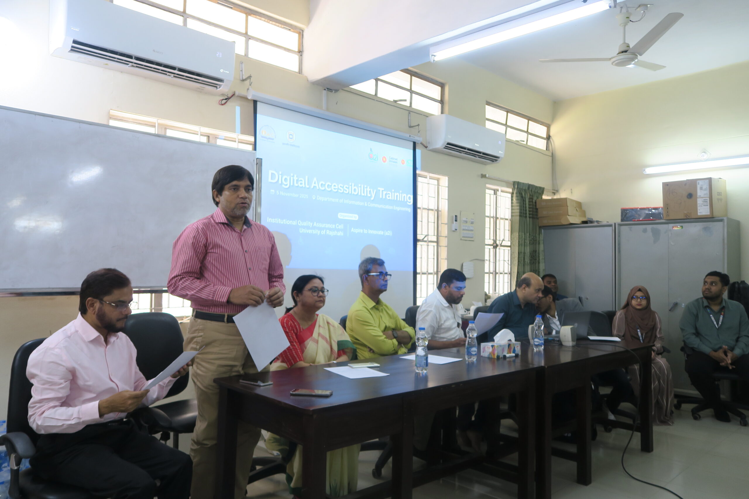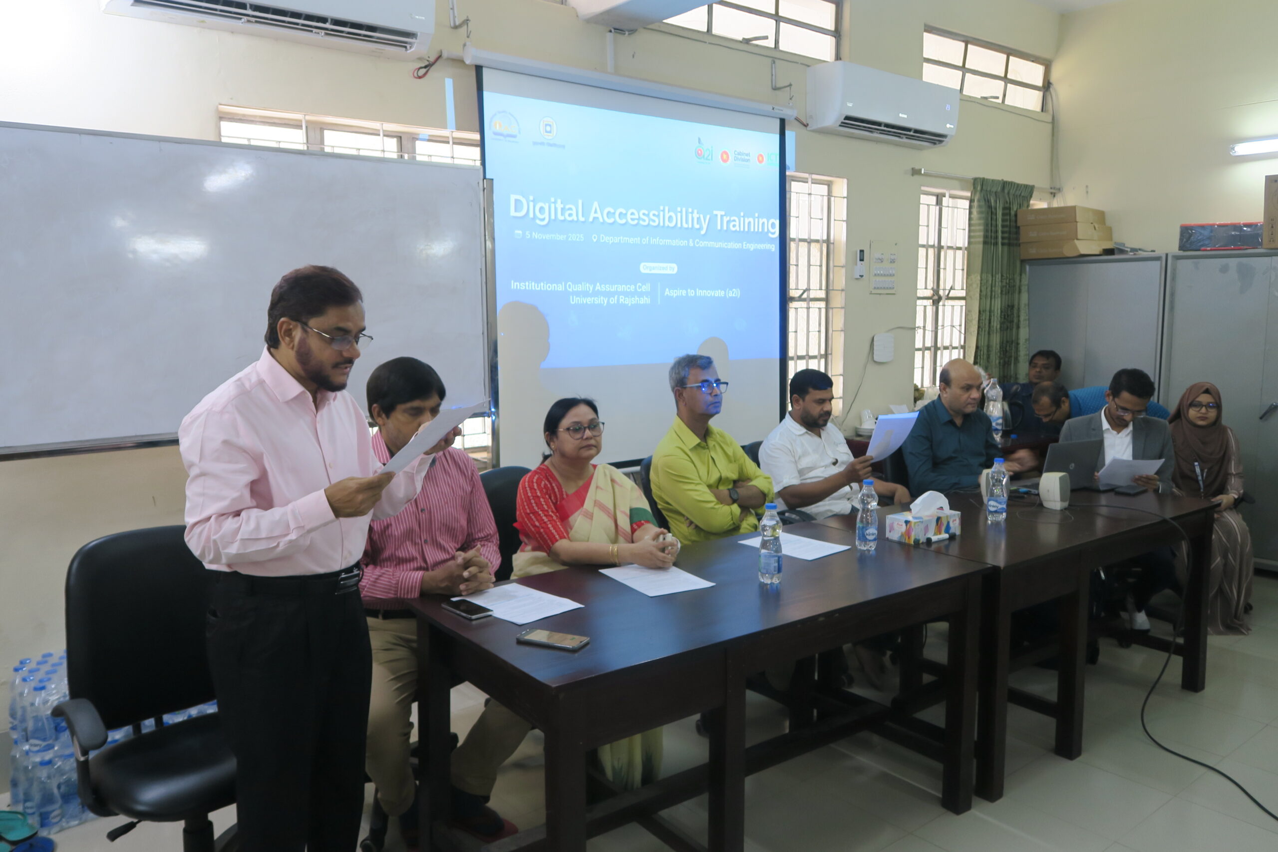 রাজশাহী, ৫ নভেম্বর ২০২৫: প্রতিবন্ধী ব্যক্তিদের জন্য অন্তর্ভুক্তিমূলক ডিজিটাল প্রযুক্তি উন্নয়নে প্রকৌশল বিভাগের শিক্ষার্থীরাই আগামী দিনের মূল চালিকা শক্তি—এই বিশ্বাস সামনে রেখে রাজশাহী বিশ্ববিদ্যালয়ের ইনফরমেশন অ্যান্ড কমিউনিকেশন ইঞ্জিনিয়ারিং বিভাগে আজ ‘ডিজিটাল অ্যাক্সেসিবিলিটি’ বিষয়ক দিনব্যাপী প্রশিক্ষণ কর্মশালা অনুষ্ঠিত হয়েছে। এসপায়ার টু ইনোভেট (এটুআই)-এর ডিজএবিলিটি ইনোভেশন ল্যাবের আয়োজনে এবং ইনস্টিটিউশনাল কোয়ালিটি অ্যাস্যুরেন্স সেল (আইকিউএসি) বিশ্ববিদ্যালয়ের সহযোগিতায় অনুষ্ঠিত এই কর্মশালায় অংশ নেন বিভিন্ন বিভাগের শিক্ষার্থীরা।