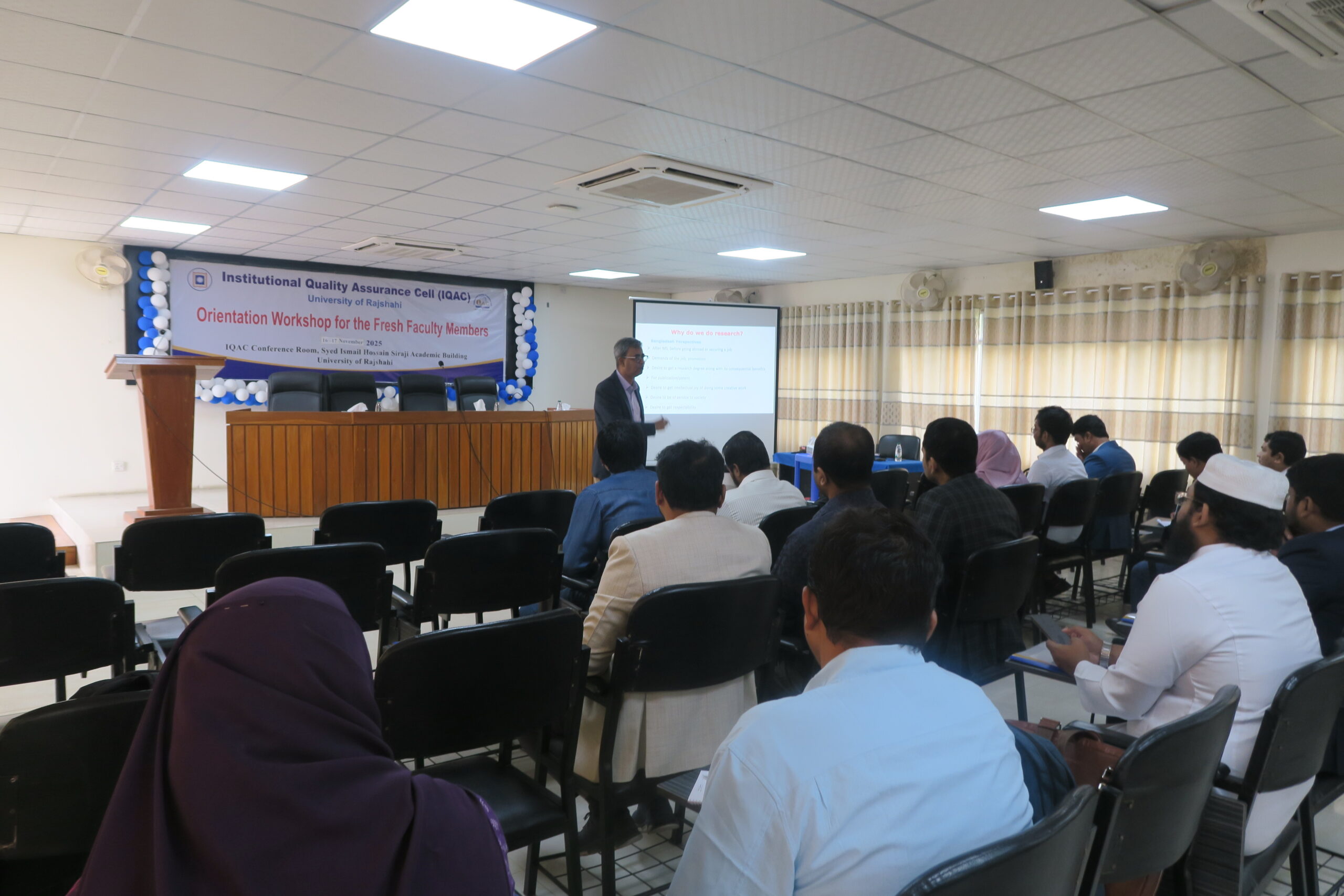 ইনস্টিটিউশনাল কোয়ালিটি অ্যাসুরেন্স সেল (আইকিউএসি) বিশ্ববিদ্যালয়ের প্রোগ্রামসমূহের অ্যাক্রেডিটেশন প্রাপ্তির লক্ষ্যে শিক্ষার গুণগত মান উন্নয়নে বিভিন্ন কর্মসূচি পরিচালনা করে আসছে। এরই ধারাবাহিকতায় রাজশাহী বিশ্ববিদ্যালয়ে সদ্য নিয়োগপ্রাপ্ত শিক্ষকবৃন্দের জন্য ‘Orientation Workshop for the Fresh Faculty Members’ শিরোনামে চলমান কর্মশালার ২য় পর্বের ৩য় গ্রুপে ১০টি বিভাগের ২৫জন শিক্ষককে নিয়ে প্রশিক্ষণ কর্মশালা অনুষ্ঠিত হয়।