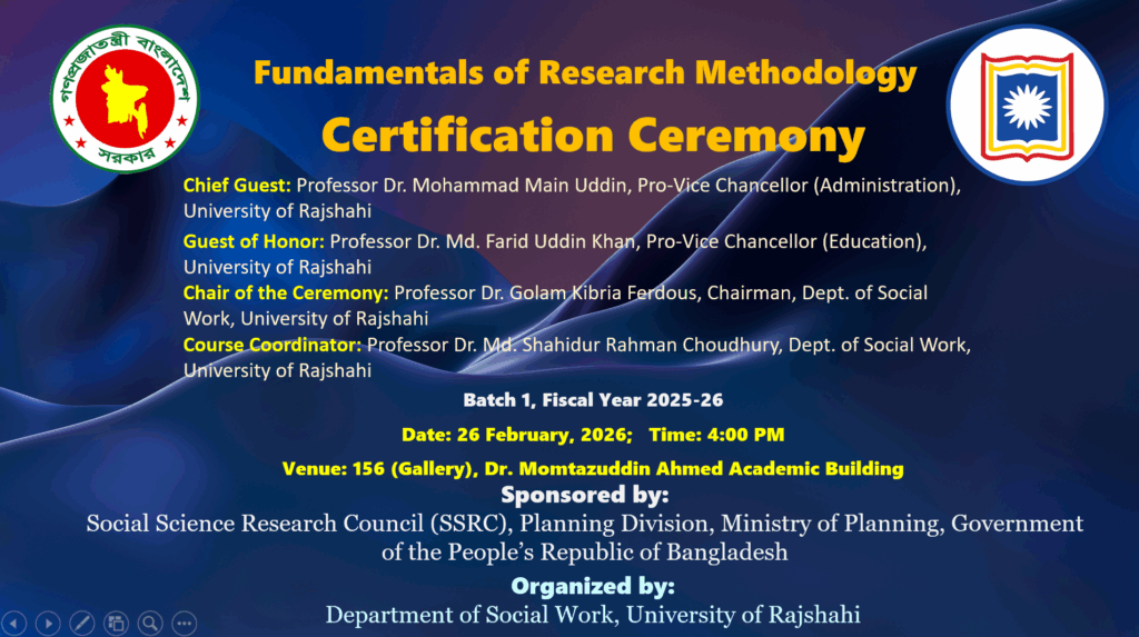 Fundamentals of Research Methodology: Certification Ceremony of Batch 1, Fiscal Year 2025-26 was held on 26 February 2026 at the Department of Social Work, University of Rajshahi. The program is organized by the Department of Social Work, University of Rajshahi. Professor Dr. Mohammad Main Uddin, Pro-Vice Chancellor (Administration), University of Rajshahi was the chief guest, and Professor Dr. Md. Farid Uddin Khan, Pro-Vice Chancellor (Academic), University of Rajshahi was the guest of honor. Professor Dr. Golam Kibria Ferdous, Chairman, Dept. of Social Work, University of Rajshahi played the role of the chair of the ceremony. Professor Dr. Md. Shahidur Rahman Choudhury, Dept. of Social Work, University of Rajshahi, the course coordinator and other faculty members were also present on the ceremony. The research training program was sponsored by the Social Science Research Council (SSRC), Planning Division, Ministry of Planning, Government of the People’s Republic of Bangladesh.